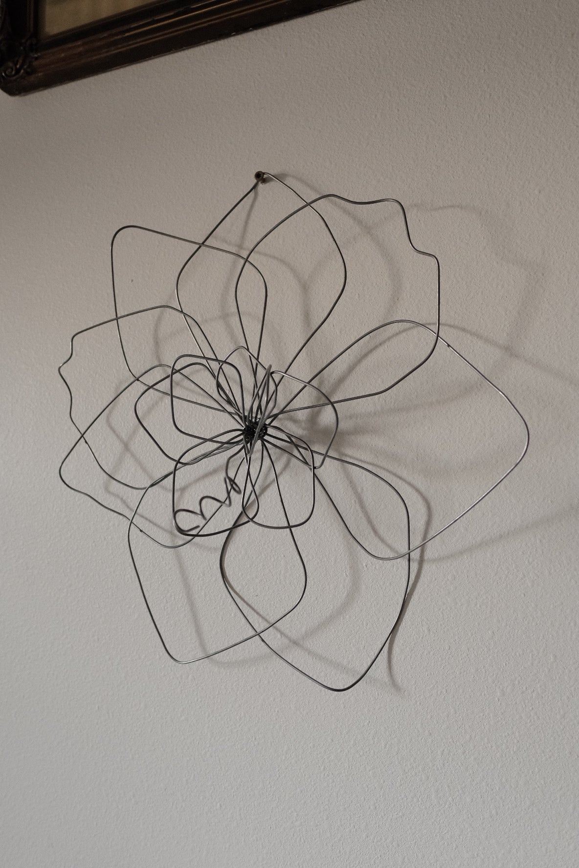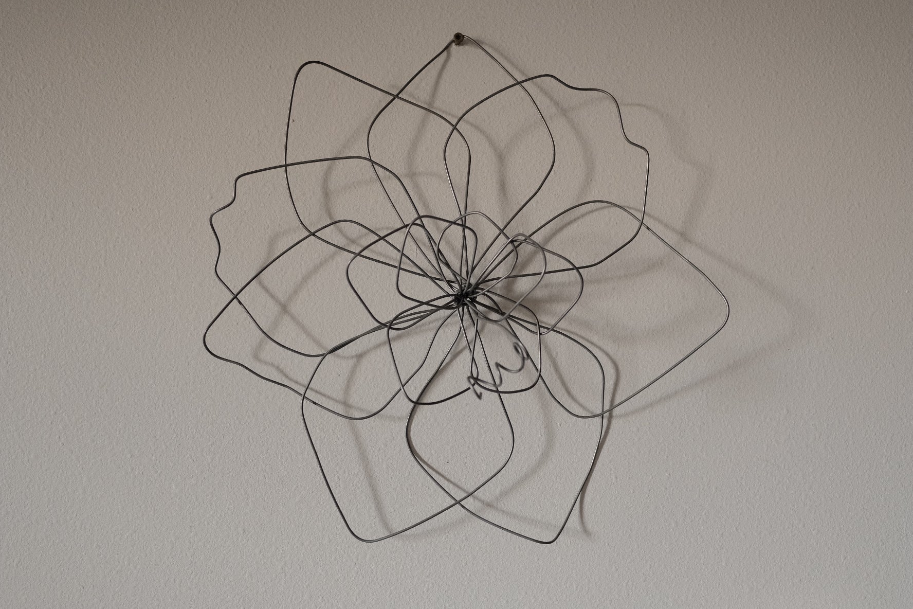 Small 15 inch wide 5 inches deep reclaimed electric fence wire flower. Wire is a light medium gray tone with some shine and the flower features soft pointed and jagged petals. Looks great in a grouping or as a stand alone piece.